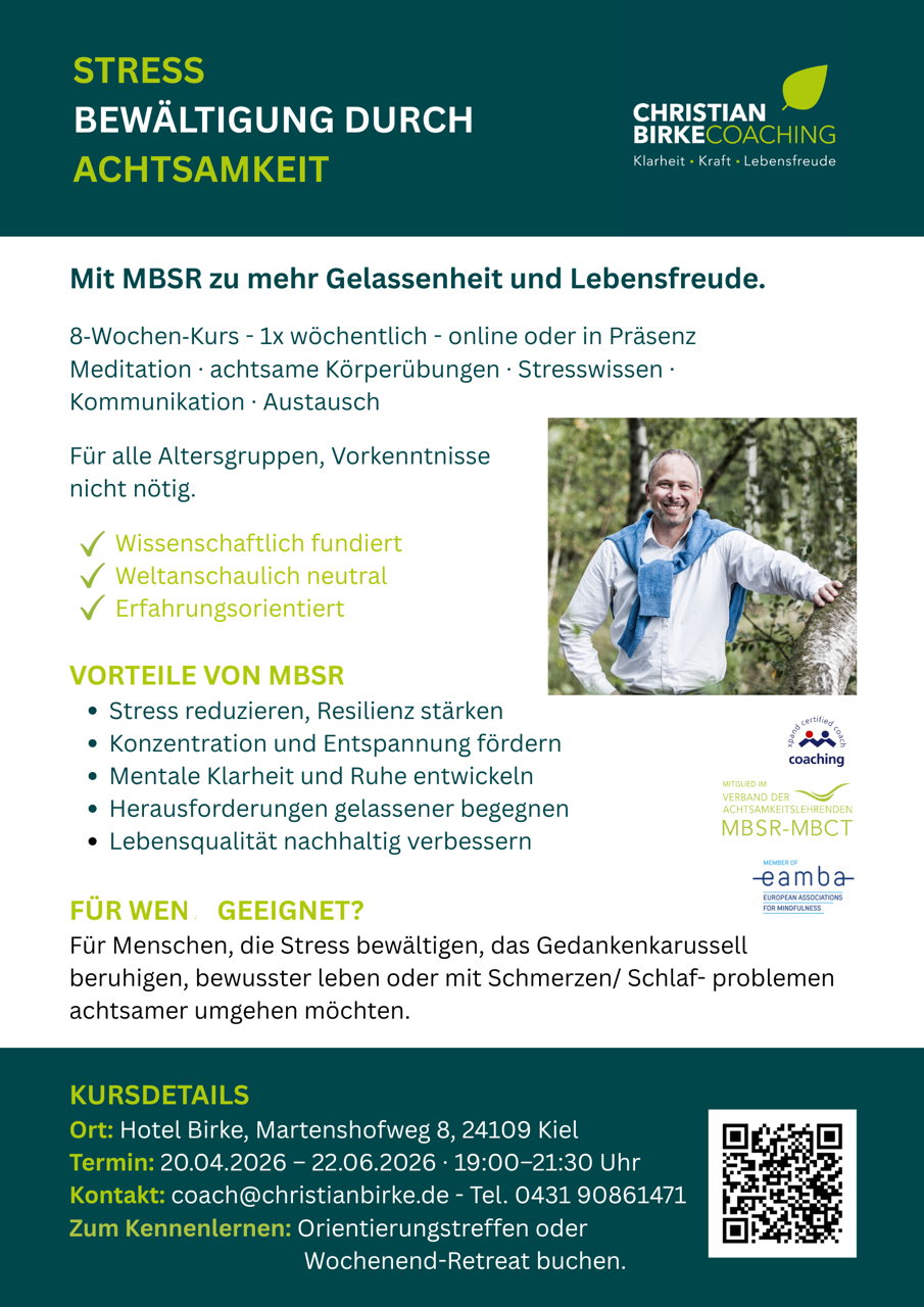 Kurs „Stressbewältigung durch Achtsamkeit“ von Jens Wilms | März 30, 2026 Herr Christian Birke bietet einen Kurs zur Stressbewältigung im Hotel Birke an. Details zum Kurs finden Sie im beiliegenden Flyer. ← Natur erleben im Hofholz