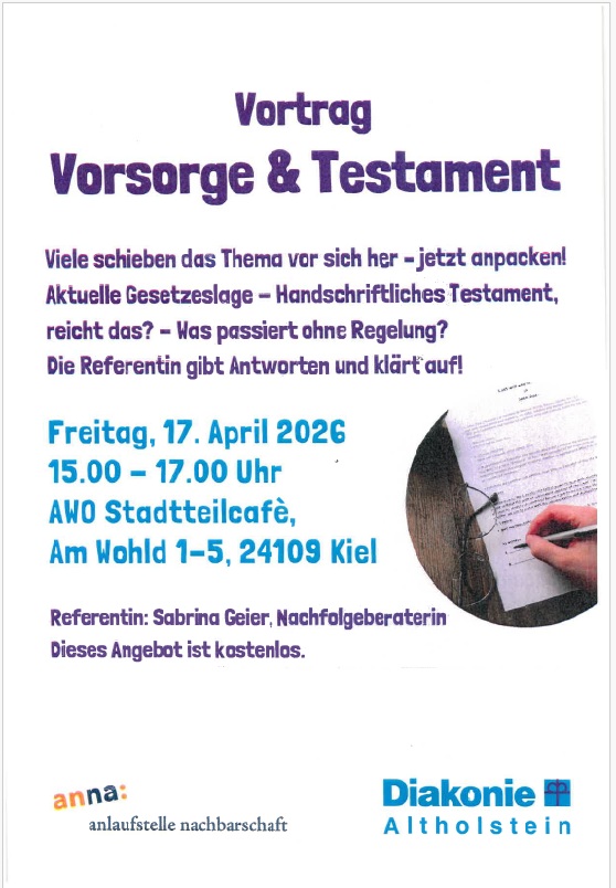 Datum und Zeit: 17. April 2026 15:00 - 17:00 Veranstaltungsort: AWO Servicehaus Am Wohld 1 Kiel Beschreibung: Mit diesem Link zum eigenen Kalender hinzufügen: ICAL