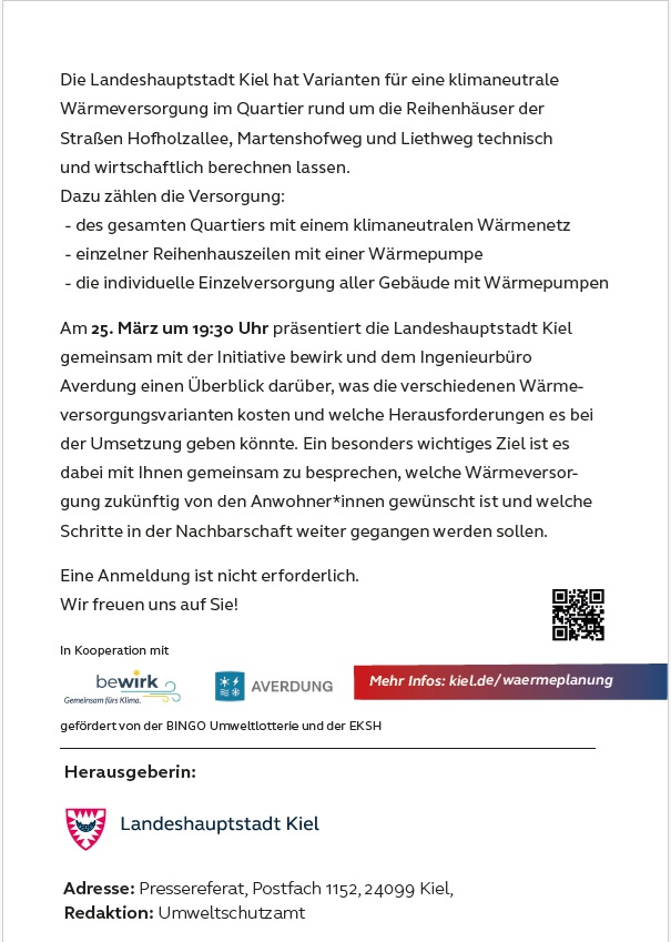 Am 25. März um 19:30 Uhr präsentiert die Landeshauptstadt Kiel gemeinsam mit der Initiative bewirk und dem Ingenieurbüro Averdung einen Überblick darüber, was die verschiedenen Wärmeversorgungsvarianten kosten und welche Herausforderungen es bei der Umsetzung geben könnte. Ein besonders wichtiges Ziel ist es dabei mit Ihnen gemeinsam zu besprechen, welche Wärmeversorgung zukünftig von den Anwohner*innen gewünscht ist und welche Schritte in der Nachbarschaft weiter gegangen werden sollen.
